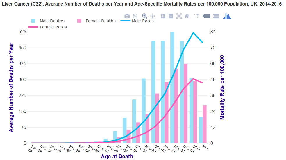 Die Sterblichkeitsrate bei Leberkrebs hängt stark mit dem Alter zusammen, wobei die höchsten Sterblichkeitsraten bei älteren Menschen zu verzeichnen sind