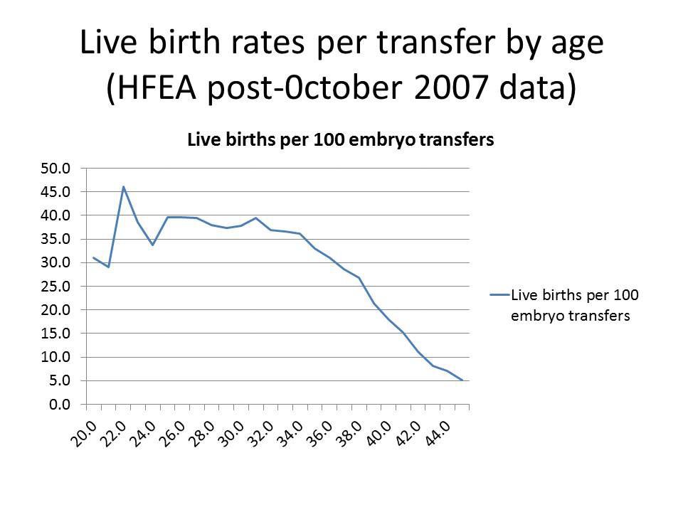 In der folgenden Grafik zeigt die vertikale Achse die Embryotransfers, die horizontale Achse das Alter der Frau