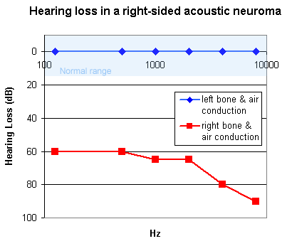 Bei einem Akustikusneurinom zeigt das Reintonaudiogramm eine ipsilaterale sensorineurale Taubheit. | ![]() |