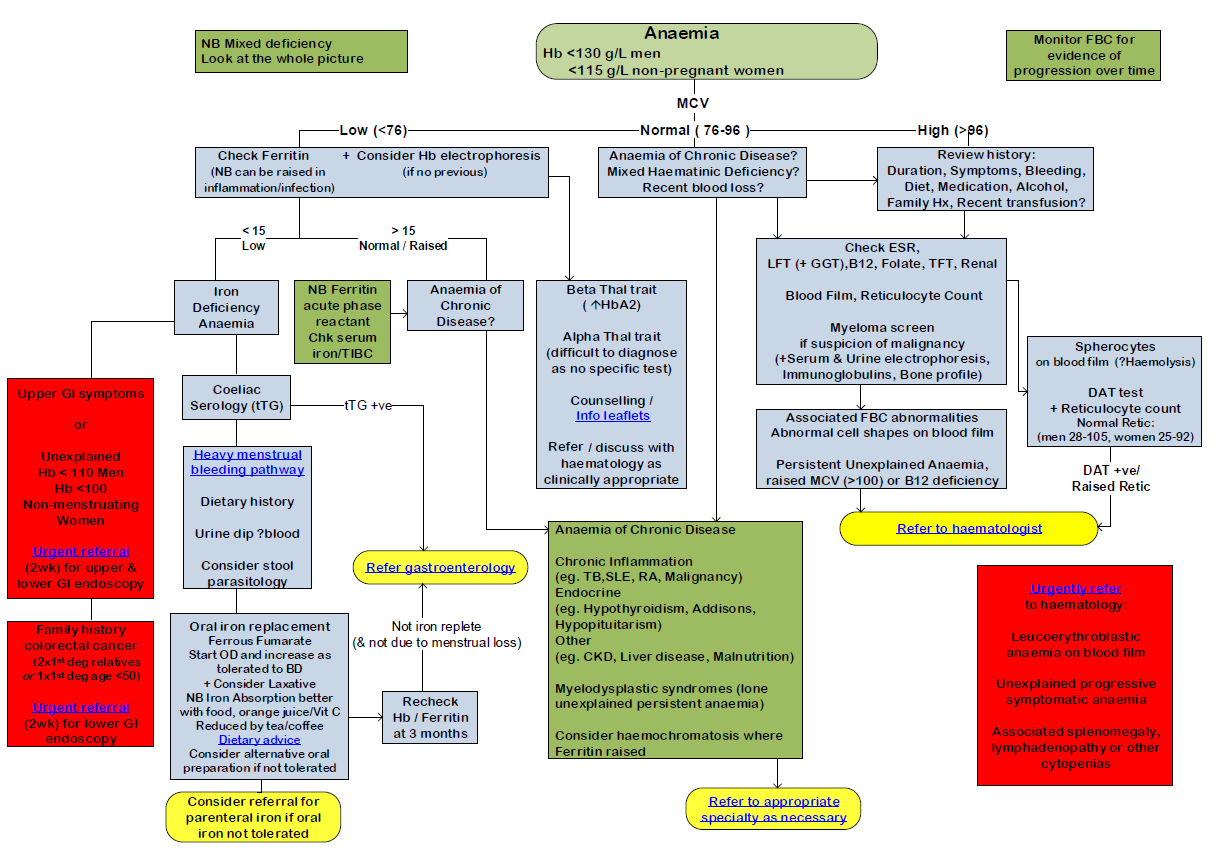 Sie kann anhand des Blutbildes klassifiziert werden; so erscheinen rote Blutkörperchen mit einem niedrigen mittleren Zellvolumen (MCV) klein und blass - mikrozytisch; solche mit einem großen MCV erscheinen groß und oval - makrozytisch. Alternativ können die Erythrozyten eine normale Größe und Form haben, aber in ihrer Anzahl reduziert sein - normozytär.