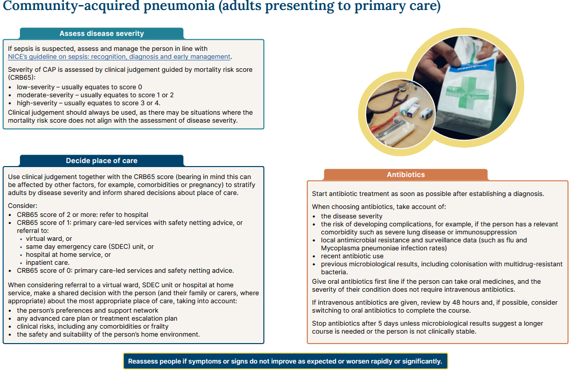 NICE has outlined the principles of management of community acquired pneumonia (1)