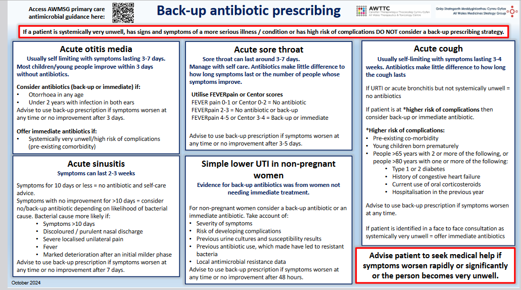 The All Wales Therapeutics and Toxicology Centre (AWTTC) has produced guidance to encourage more consistent implementation of a back-up prescribing strategy by all healthcare professionals in primary care. This is displayed below: