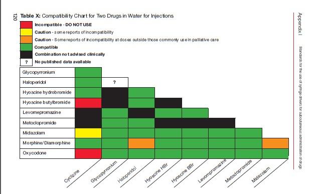 Compatibility of drugs when mixed in water for injection (palliative care)