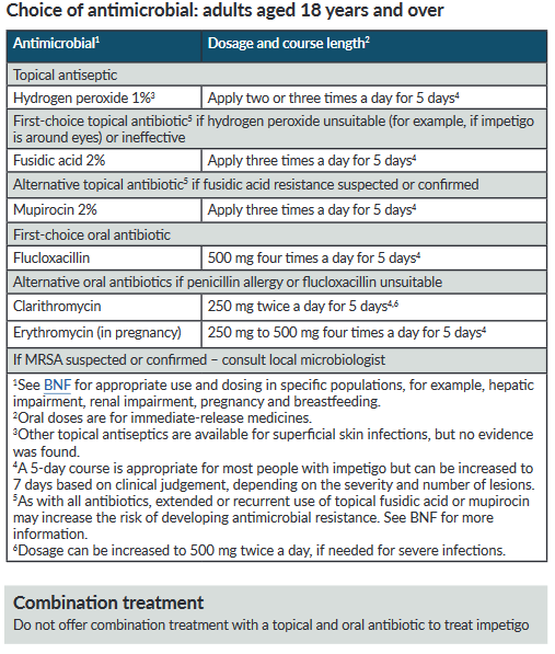 NICE suggest an algorithm for treatment based on features of the impetigo presenting to the clinician (1):