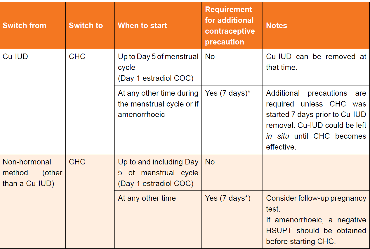 CHC, combined hormonal contraception; COC, combined oral contraception; Cu-IUD, copper intrauterine device; HSUPT, high-sensitivity urine pregnancy test.