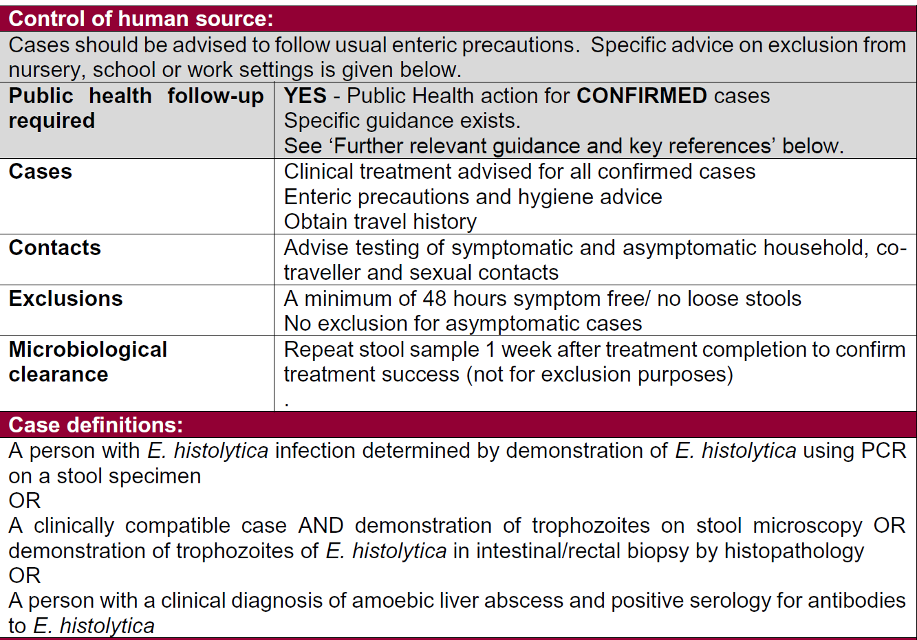For further information then see full guideline for detailed advice - https://assets.publishing.service.gov.uk/government/uploads/system/uploads/attachment_data/file/861382/management_of_gastrointestinal_infections.pdf