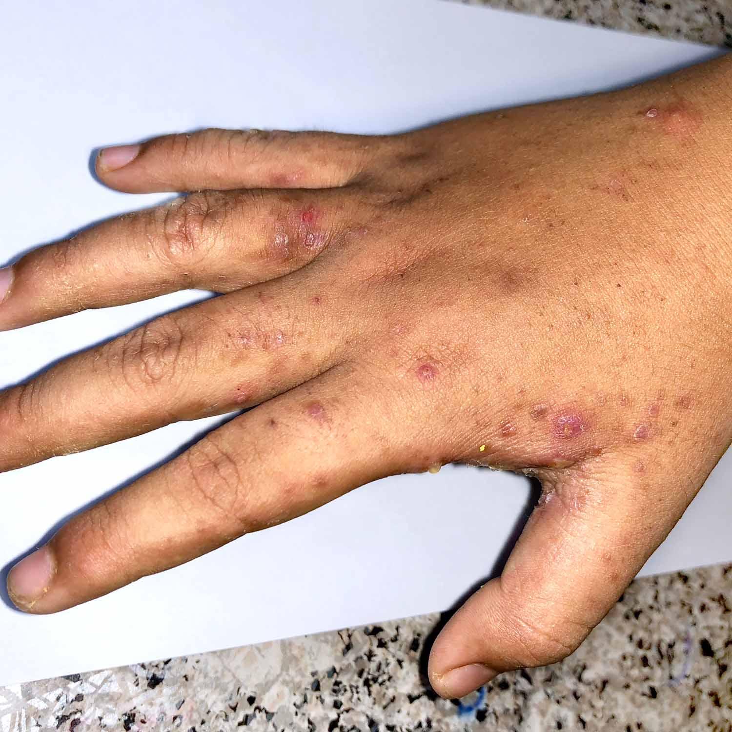 - Other common findings on examination include a generalised rash with erythema and papules. These papules are often excoriated and distributed in a symmetrical pattern over the limbs and trunk.