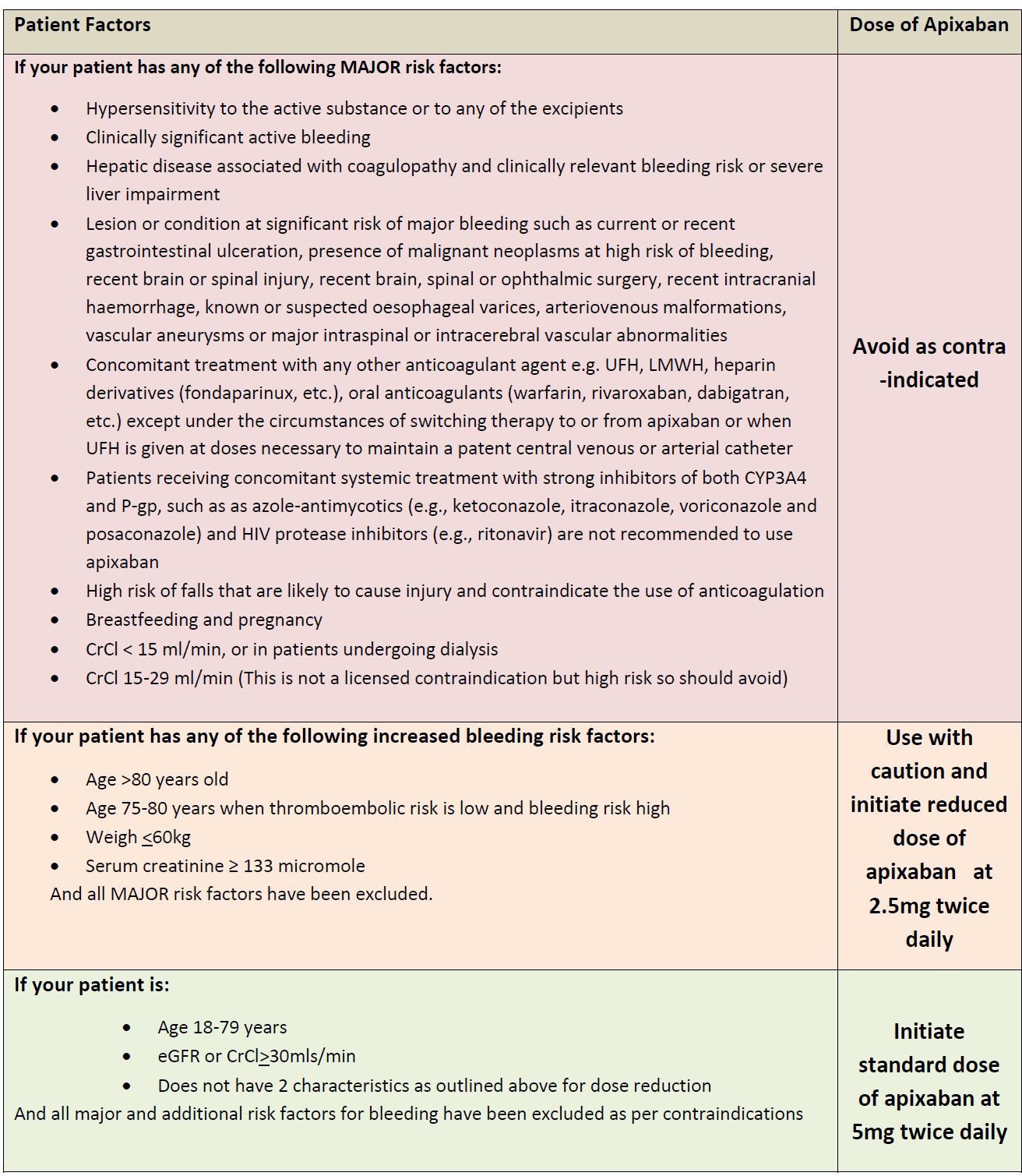 Hemorragia activa; riesgo significativo de hemorragia grave (por ejemplo, úlcera gastrointestinal reciente, varices esofágicas, cirugía cerebral, espinal u oftálmica reciente, hemorragia intracraneal reciente, neoplasias malignas, aneurisma vascular). El uso de apixabán no está autorizado en pacientes con válvulas cardiacas protésicas. Apixaban está contraindicado en enfermedades hepáticas graves. Apixaban debe utilizarse con precaución en pacientes con enzimas hepáticas elevadas.