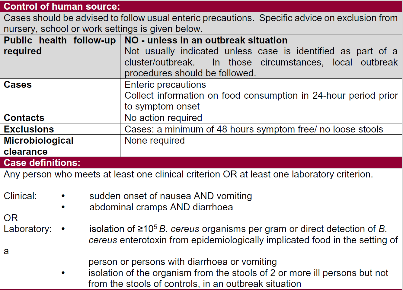 Todas las personas con gastroenteritis deben ser consideradas potencialmente infecciosas para los demás y excluidas del trabajo, la escuela u otros entornos institucionales y sociales hasta un mínimo de 48 horas sin síntomas ni heces blandas.