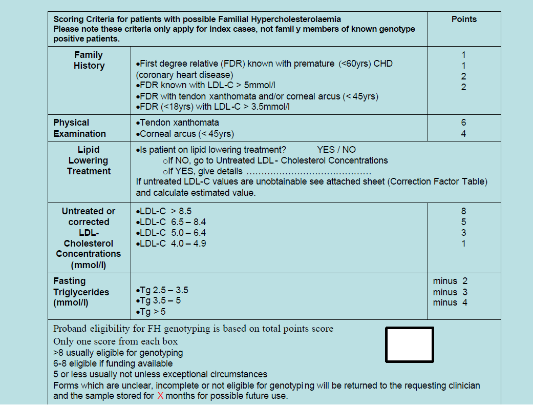 Welsh Familial Hypercholesterolaemia (FH) Score was developed based on a modification of the Dutch Lipid Clinic scoring criteria (1) to guide genetic testing of index patients presenting with hypercholesterolaemia.