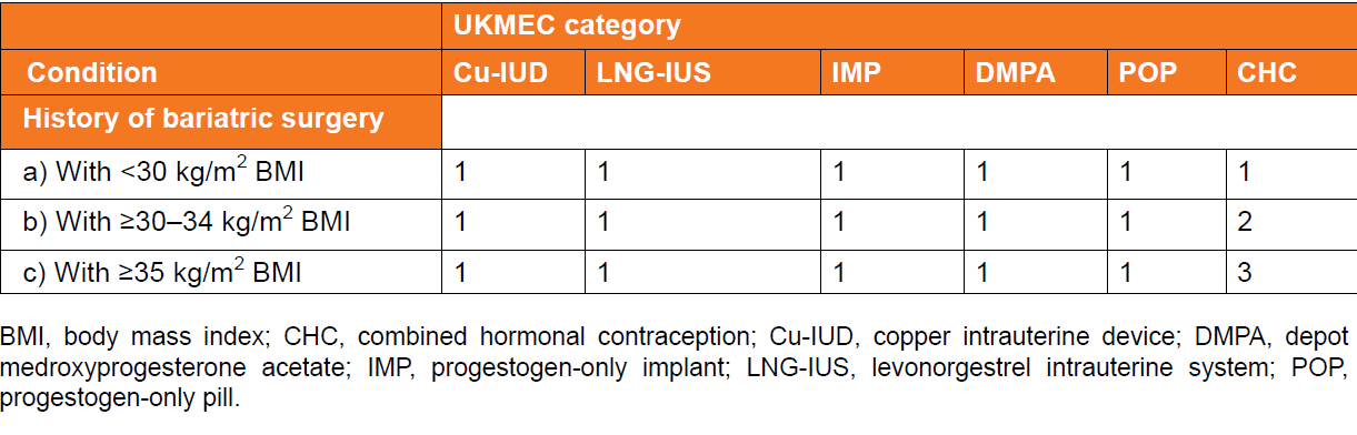 UK Medical Eligibility Criteria for Contraceptive Use (UKMEC , UK MEC) recommendations for contraceptive safety following bariatric surgery
