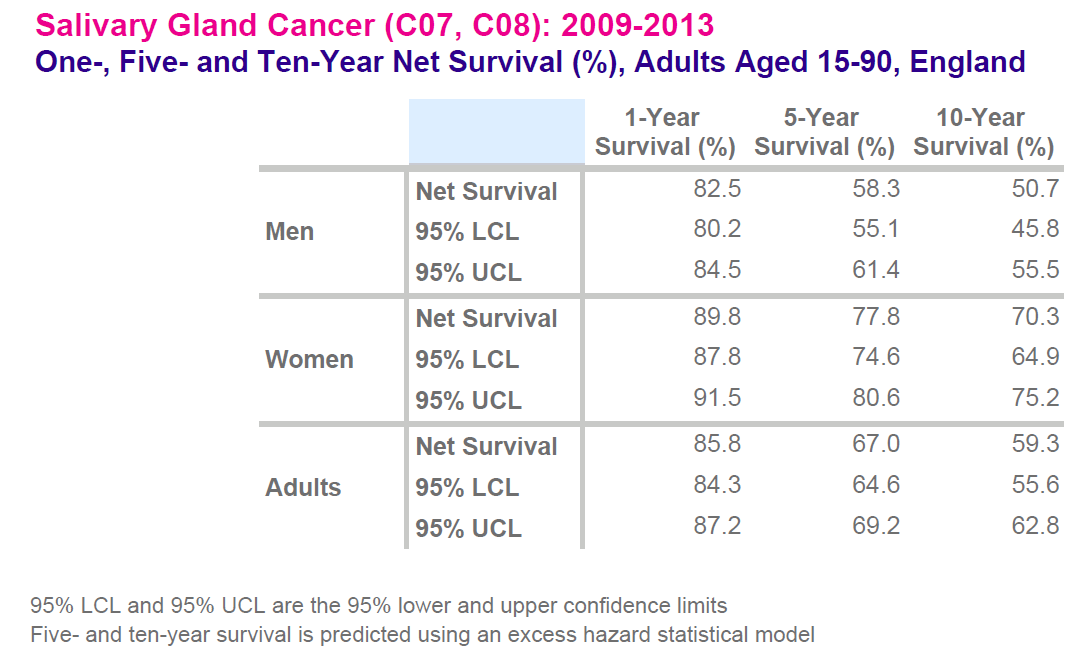 83% of men survive salivary glands cancer for at least one year, and this is predicted to fall to 58% surviving for five years or more, as shown by age-standardised net survival for patients diagnosed with salivary glands cancer during 2009-2013 in England. Survival for women is higher with 90% surviving for one year or more, and 78% predicted to survive for at least five years.